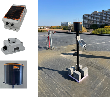 The Rain-mX system is a computer module, battery module, solar panel, tipping bucket rain gauge, and an environmental sensor (temperature, barometric pressure, relative humidity). Rain-mX uses cellular data transmission. A stand-alone mounting configuration is available for additional cost (pricing below).